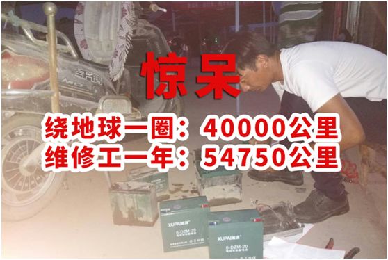 旭派电池按照一个修理工平均一天修3辆车,每辆车一天骑50公里来算(当然配上高品质的旭派电池话,里程则另当计算啦),那么这些修过的车一年跑起来的距离就是3辆 X 50公里/辆·天 X 365天 = 54750公里,足于绕地球地球40000公里一圈,不算不知道,一算吓一跳啊!